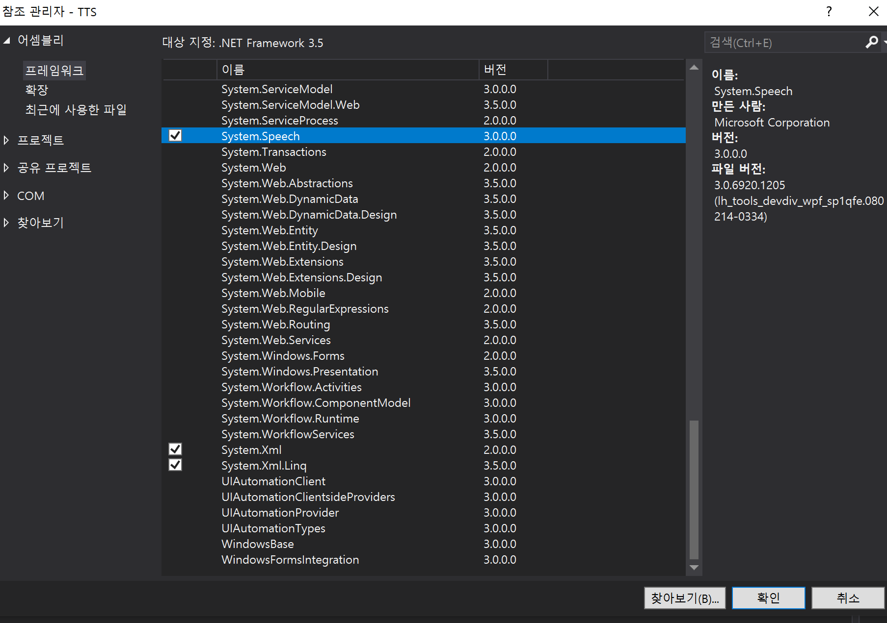 TTS 사용하기 위해선 프로젝트에 참조 관리자를 통해서 참조 추가해야 함.
