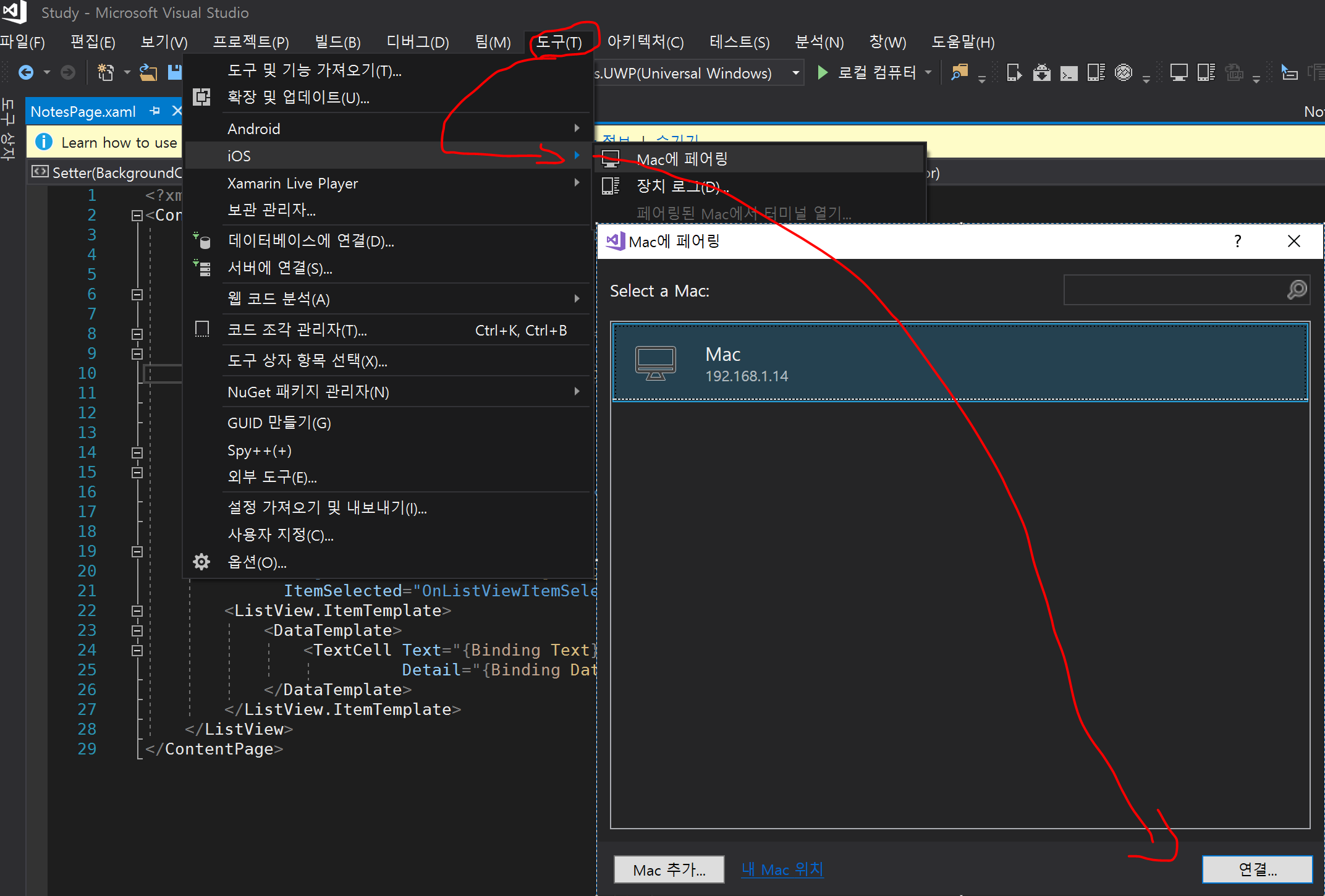 페어링 하기 위해 VisualStudio와 XCode를 설치해야 함.