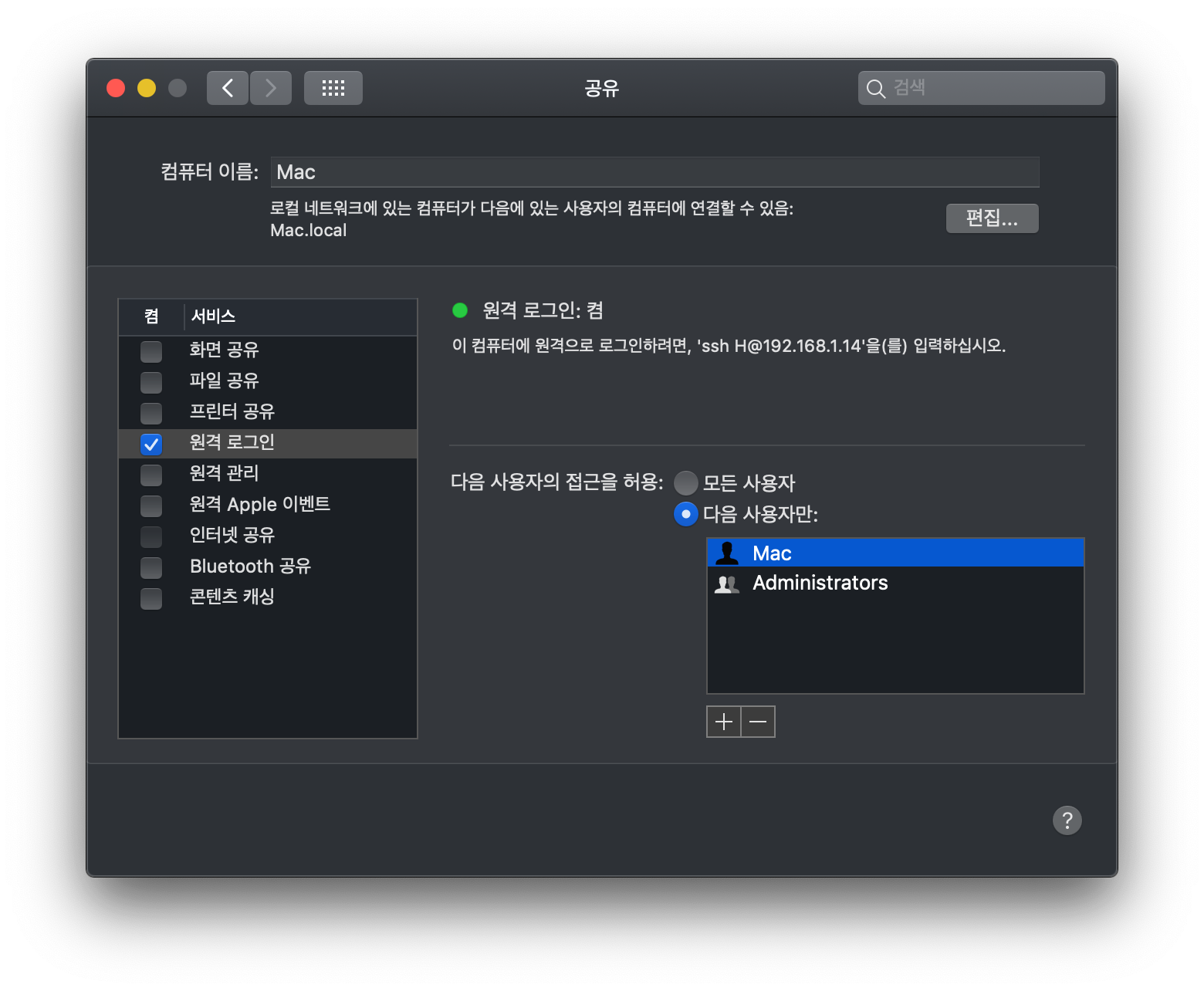 시스템 환경설정에 공유로 들어가 원격 제어할 수 있게 추가해 줘야 함.